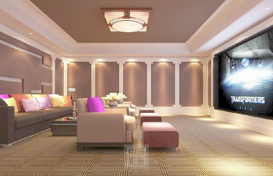 而獨(dú)立影音房處理起來(lái)就要嚴(yán)肅得多。獨(dú)立影音房沒(méi)有了客廳的那些環(huán)境光干擾問(wèn)題,可以從效果最優(yōu)的角度考慮,所以基本都會(huì)用畫(huà)框幕(相對(duì)于電動(dòng)幕更平整,用久了也不會(huì)卷邊,故障率基本為0)。這里也可以分為2種情況,使用透聲幕、不透聲幕。不管用透聲幕還是不透聲幕,都要盡量保證視聽(tīng)室環(huán)境是暗色調(diào)(使用深色裝修材料),避免光污染,前墻上畫(huà)框幕的周?chē)彩且粯印?