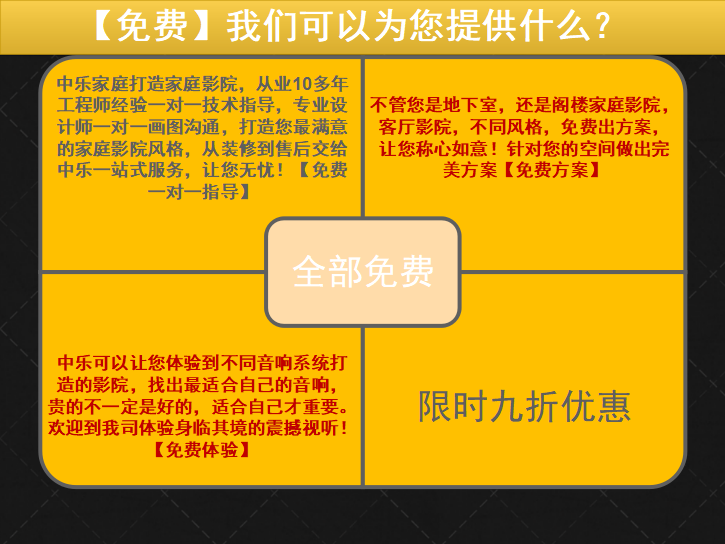首頁 技術(shù)分享 【中樂影音】現(xiàn)在預(yù)約咨詢即可獲得9折限時(shí)優(yōu)惠! 【中樂影音】現(xiàn)在預(yù)約咨詢即可獲得9折限時(shí)優(yōu)惠! 2374天前 上一篇:比專業(yè)更為專業(yè)!深圳灣片區(qū)頂級影音房案例 下一篇:組建完整的私家電影院詳細(xì)流程 熱門推薦 家庭ktv音響選多大的喇叭好? 2025-09-05 14:20 教你5招解決視聽室隔音問題 2021-09-01 17:02 立體聲與視聽室不為人知的小秘密 2021-09-01 16:34 夏季高溫,這樣使用影音室投影機(jī)是錯(cuò)誤的! 2021-07-14 14:20 某頂級豪宅—AURO3D院線同步案例 2019-04-17 09:22